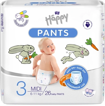 bella baby Happy Pants Midi primarily offers comfort and safety for your child as they begin to learn independence. The Quick & Easy System ensures a fast diaper change, letting your little one get back to exploring the world. The safety and quality of our products have been confirmed by a Dermatest certificate and a positive opinion from the Mother and Child Institute.